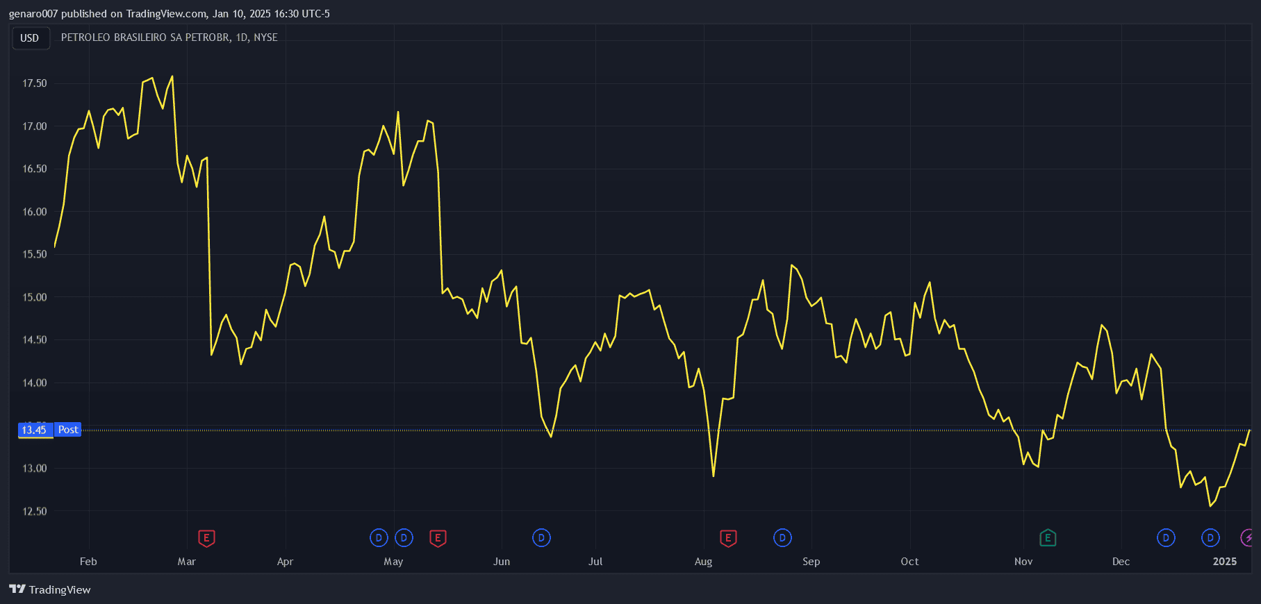 Vývoj akcií společnost Petroleo Brasileiro na New Yorské burze v roce 2024