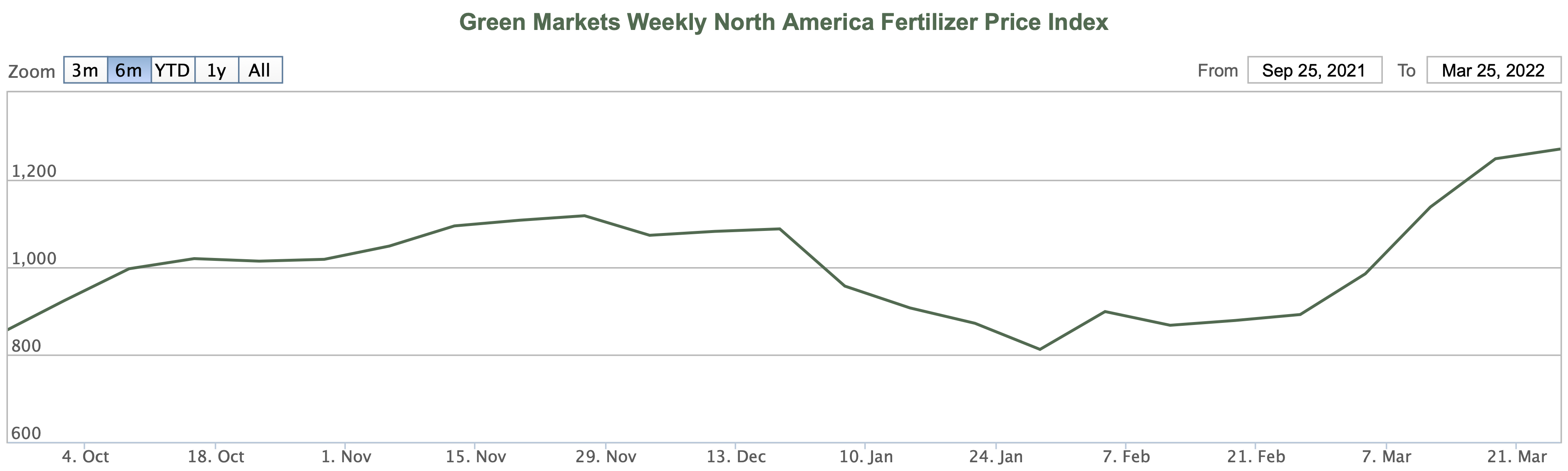 Celosvětové neboli tržní ceny hnojiv jsou aktuálně na historických maximech. Americký Green Markets North America Fertilizer Price Index od začátku ruské invaze na Ukrajinu vzrostl o 40 %.