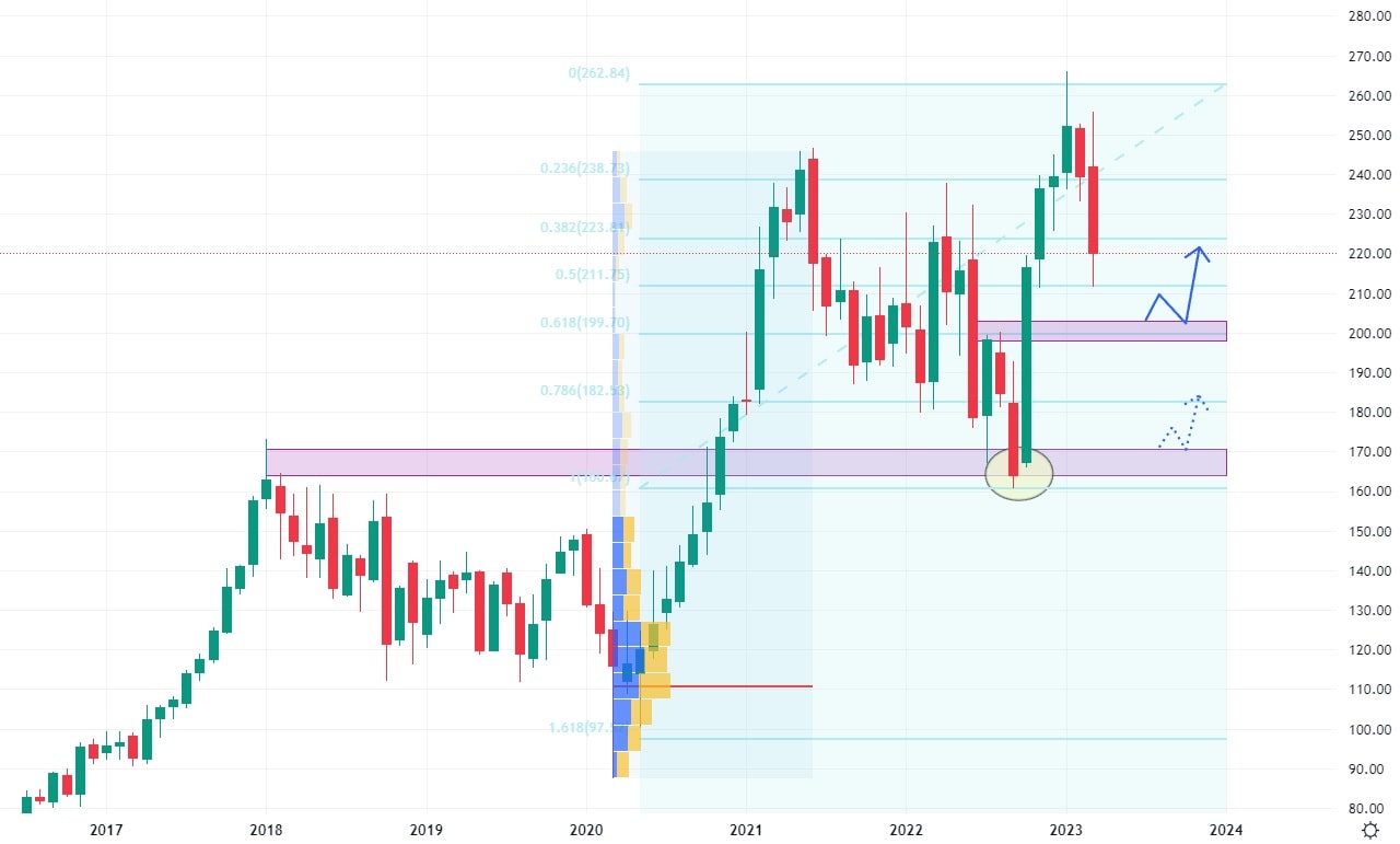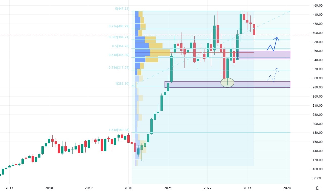 Akcie Deere & Company se od roku 2021 obchodují ve volatilním postranním trendu s férovou hodnotou (POC) okolo 360 USD. Akciím na tyto částky pomohl agresivní cenový růst v roce 2020. Trh na přelomu roku vytvořil své maximum a od té doby klesá. Nejbližší support se nachází na ceně 360 USD, kde vznikla konfluence největšího volume a 61,8 % Fibonacciho retracementu.