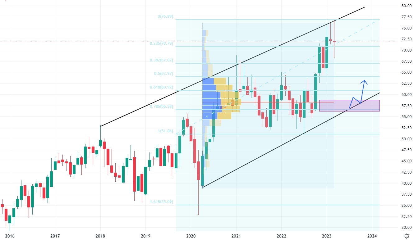 Akcie PACCAR se od roku 2018 obchodují v rostoucím trendovém kanále přičemž férová cena POC, se nachází mnohem níže, než je současná cena. Ta zakotvila na horní hraně trendového kanálu, kde minulý měsíc uzavřela svíčkovou formací pin bar, která je vnímána jako reverzní. Pokud dojde k poklesu ceny k POC, bude se jednat o pád na hodnotu 57 USD za akcii. Na této cenové úrovni také existuje konfluence s 78,6 % Fibonacciho retracementu.