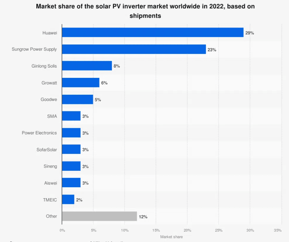 Podle společnosti SolarPower Europe mají čínské firmy v Evropě přibližně 65 % solárního trhu, kterému dominují Huawei a Sungrow.