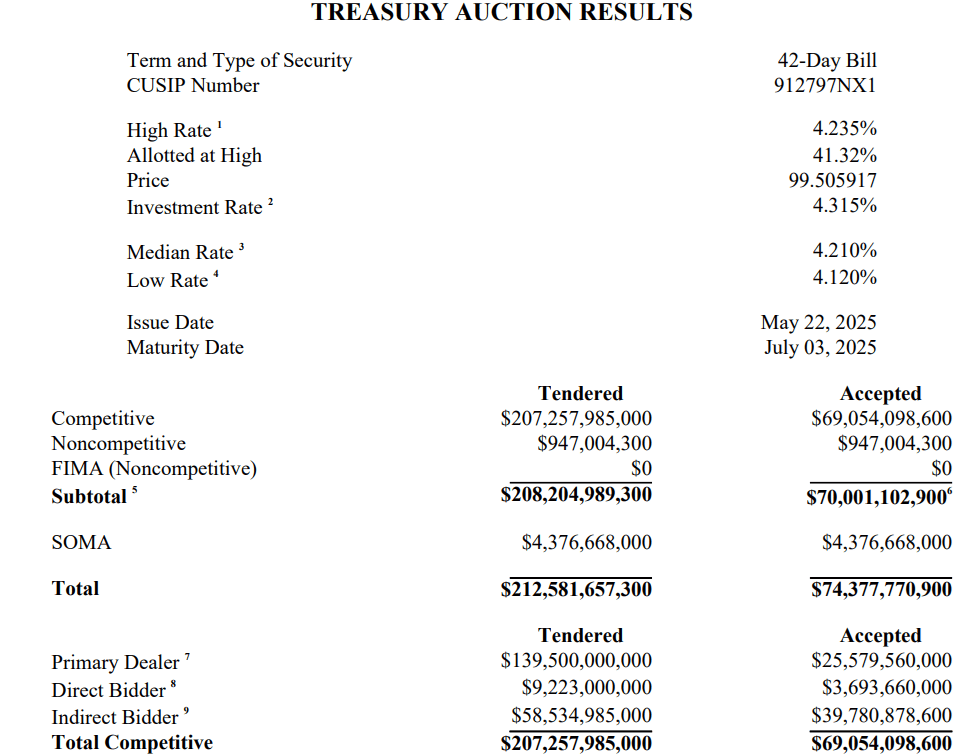 Data TreasuryDirect to však vyvracejí a ukazují, že za 42denní státní pokladniční poukázky bylo nabídnuto více než 69 miliard dolarů. Kiyosaki nazval dluhopisy a americký dolar falešnými penězi.