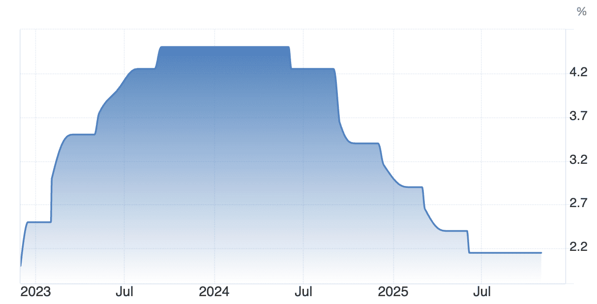 Vývoj základní úrokové sazby ECB za poslední 3 roky