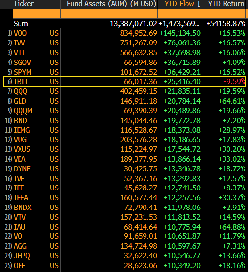 Bitcoinovému ETF IBIT, za kterým stojí BlackRock, v tomto roce náleží 6. místo ze všech dostupných fondů na světě z hlediska přílivu kapitálu. A to i přes to, že má fond negativní výkonnost.