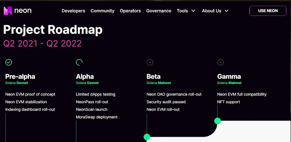 Roadmap projektu Neon, aktuálně ve fázi Alpha
