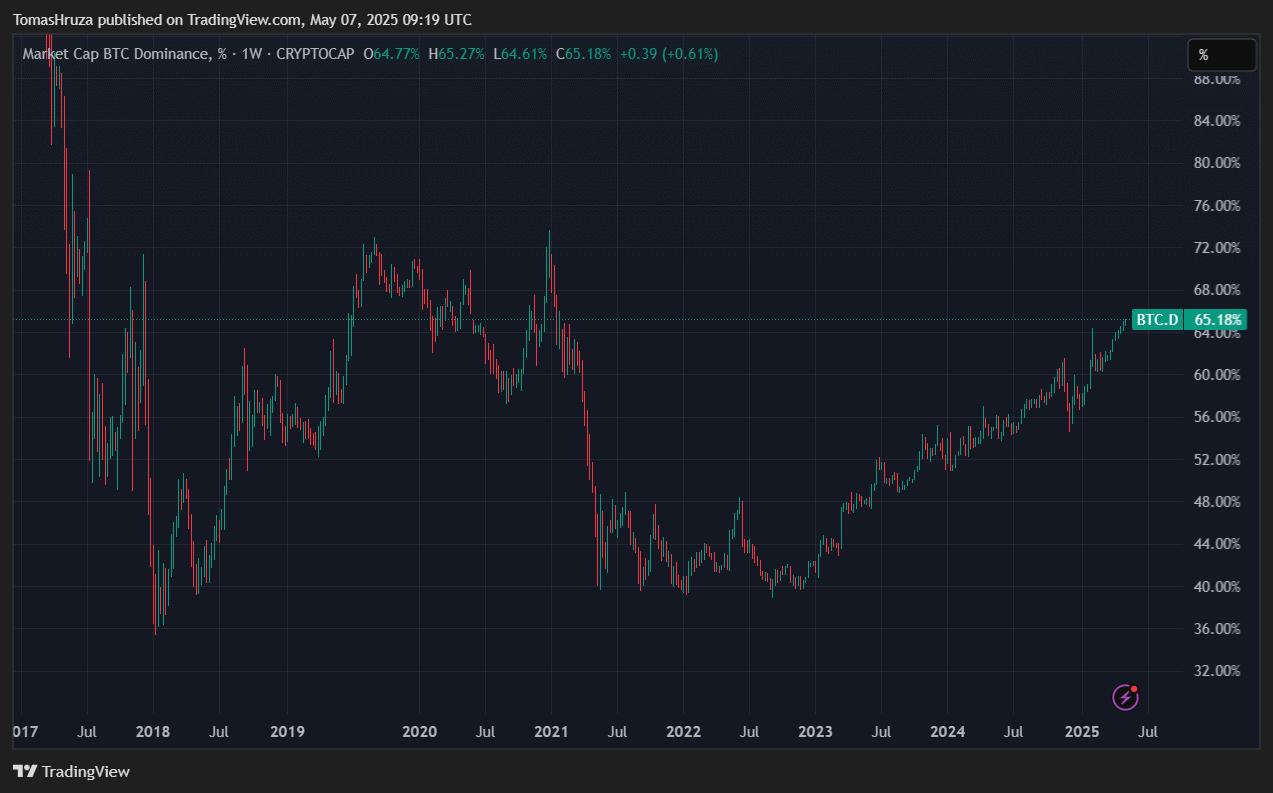 Dominance Bitcoinu na kryptoměnovém trhu je na vysokých úrovních a činí přibližně 65 %. To je nejvyšší úroveň od ledna 2021, což svědčí o tom, že investoři dávají přednost Bitcoinu před ostatními digitálními aktivy.