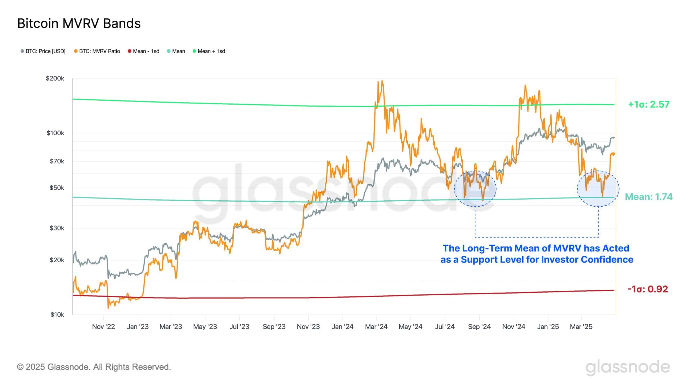 Kromě toho data společnost Glassnode ukazují, že se poměr tržní hodnoty Bitcoinu k jeho realizované hodnotě (MVRV) vrátil na svůj dlouhodobý průměr 1,74.