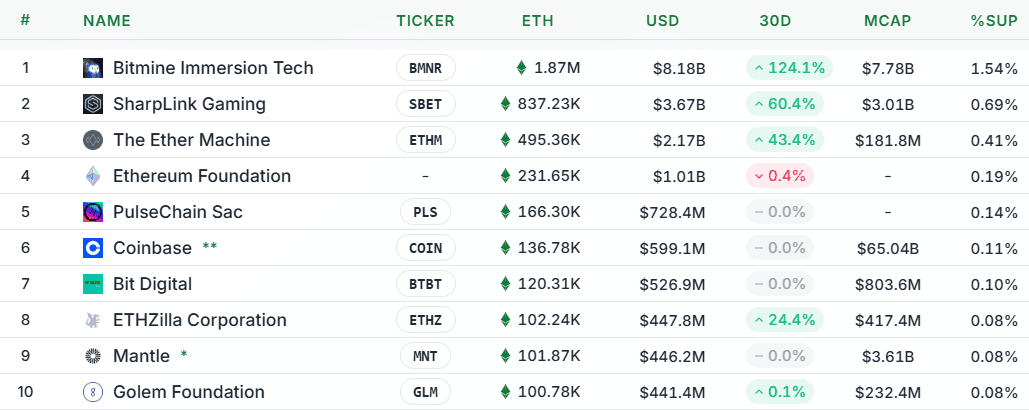 Společnost BitMine nyní vlastní 8,18 miliardy dolarů v ETH, zatímco Sharplink 3,67 miliardy dolarů. Dohromady do této kryptoměny investovalo 70 firem, které drží téměř 4 % nabídky Etherea v oběhu.