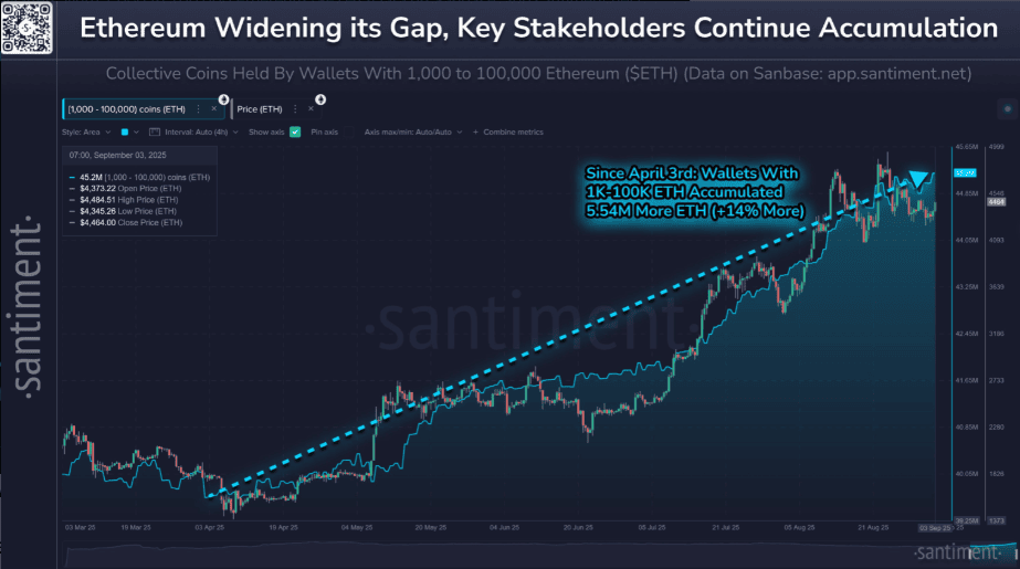 Data společnosti Santiment ukazují, že velryby – ty, které mají 1 000 až 100 000 ETH – navýšily během posledních pěti měsíců jimi držené množství ETH o 14 %. To odpovídá 5,5 milionu etherů.