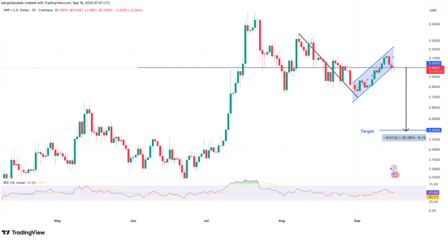 Pokud bude mít XRP problém udržet úroveň 3 dolarů, kde se nachází 50denní jednoduchý klouzavý průměr (SMA), může se jeho cena propadnout až na 2,7 dolaru, kde je významný support.