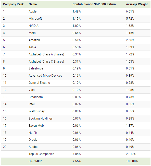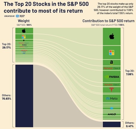 Top 20 akcií zastává pouhých 29,17 % z indexu S&P 500, ale mají na svědomí 7,08 % letošního růstu z 0,47 %