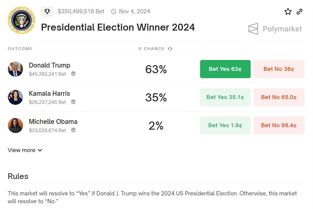 Například na výsledek amerických voleb je nyní vsazeno přes 350 milionů USD v hlavním poolu a další miliony v ostatních. Favoritem voleb je dle sázejících z celého světa Donald Trump s pravděpodobností zvolení 65 %.