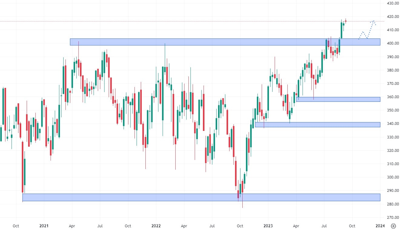 Akcie Mastercard dokonce své historické maximum dokázaly pokořit a nyní nezadržitelně rostou. I ony za svým růste zanechávají minimum supportních úrovní, ale větší množství cenových výběžků. Nejbližší cenový výběžek, který může v případě pádu sehrát roly supportu, se nachází až na ceně 360 USD. Hodnota akcií může v blízké budoucnosti poněkud klesnout a provést tzv. pullback, což je technická formace, při které se trh po průrazu vrací na hodnotu původního ATH, aby se od ní opět odrazil směrem do růstu. Tato formace by investorům umožnila pořídit akcie levněji a účastnit se tak dalšího případného cenového růstu.
