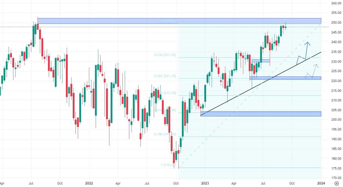 Akcie společnosti Visa se obchodují nad hodnotou rostoucí trendové čáry a za sebou zanechávají větší množství knotů. Ty v případě poklesu hodnoty akcií mohou v trhu fungovat jako supportní úrovně. Ovšem horší je to s konfluencemi, které s knoty svíček příliš nekorespondují. Jedinou cenovou úrovní, kde můžeme konfluenci pozorovat, je až cena 220 USD, kde se nachází 38,2 % Fibonacciho retracementu. Akcie Visa atakují své historické maximu, takže investoři by měli spíše konzervativně vyčkávat na to, jakým směrem se akcie nakonec vydají.