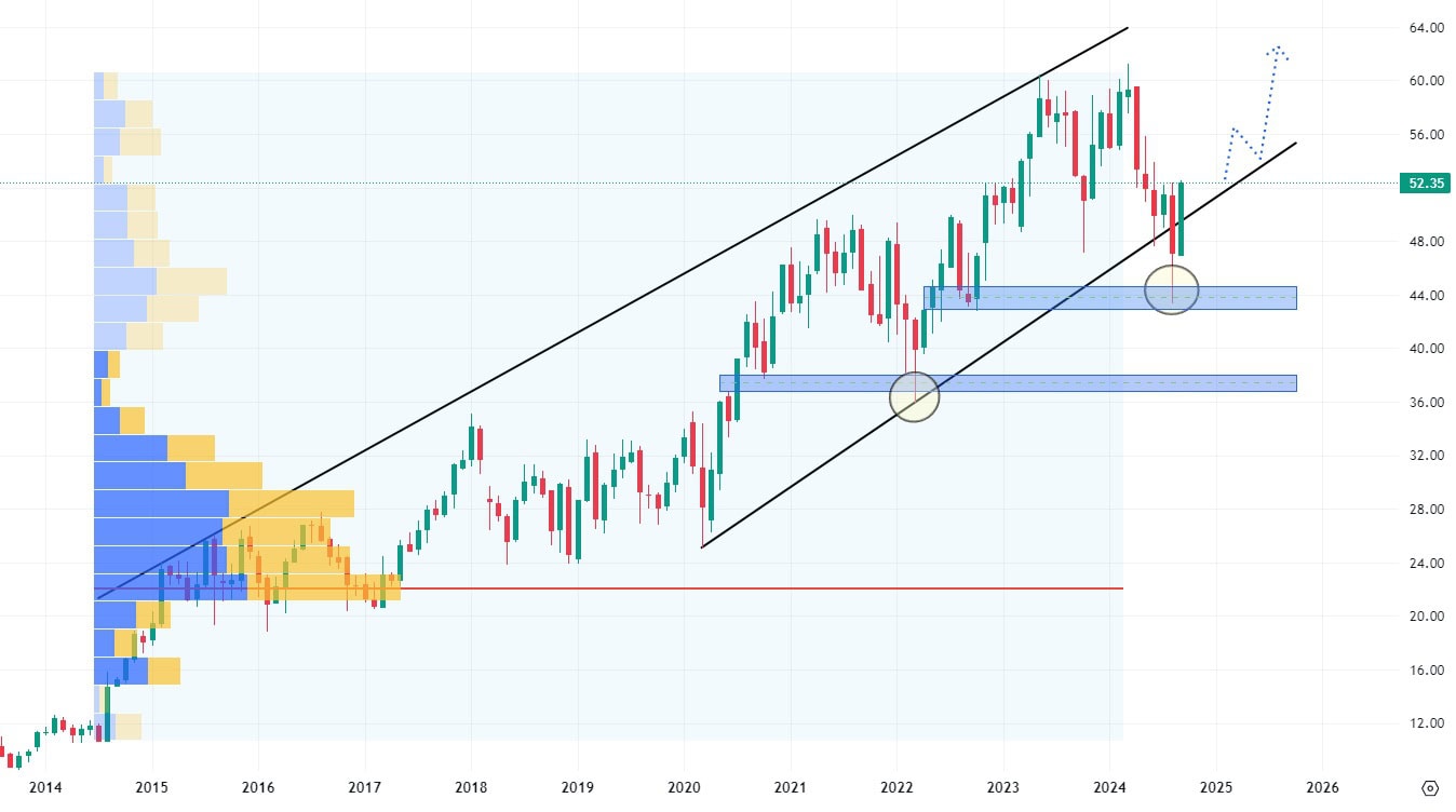 Vzhledem k dlouhodobému cenovému vývoji mají tyto akcie před sebou další růstový trend, který by měl být veden až na hodnotu horního pásma růstového kanálu, tedy k ceně okolo 65 USD za akcii.