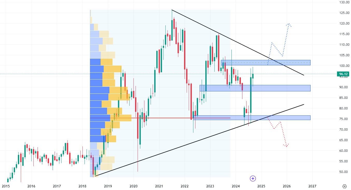 Akcie Starbucks se obchodují ve formaci triangl, která má poměrně široké rozpětí. Trh otestoval hodnotu supportu, kde kromě swingového low figurovala také konfluence s výrazným volume.