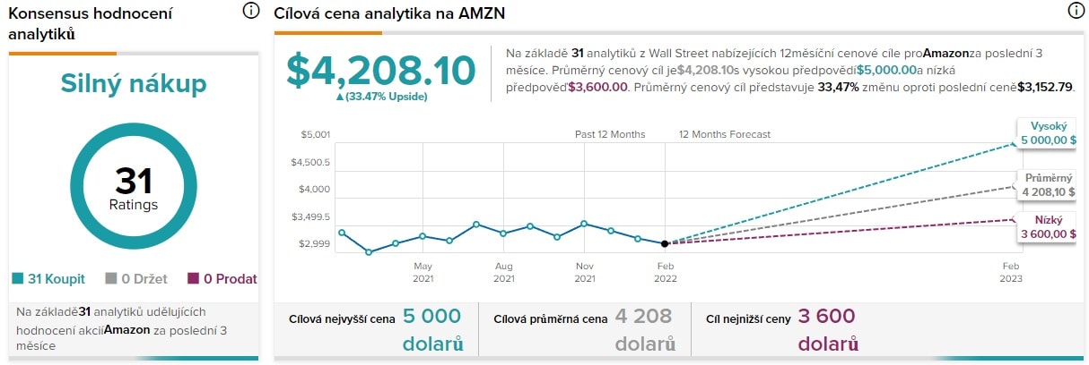 Akcie Amazon jsou velmi konzistentní, cena se pohybuje v pásmu 2 800 – 3 800 USD za akcii. Pozitivní výsledky 4Q naznačují možnost pokračujícího růstu. Čisté tržby společnosti se ve 4Q zvýšily o 9 %, čistý zisk se zvýšil na 14,3 miliardy USD (zisk na akcii 27,75 USD). Společnost Amazon má jeden z nejvyšších ratingů ve kterém se 31 analytiků shoduje na akciovém růstu k hodnotám 4 200 USD za akcii.
