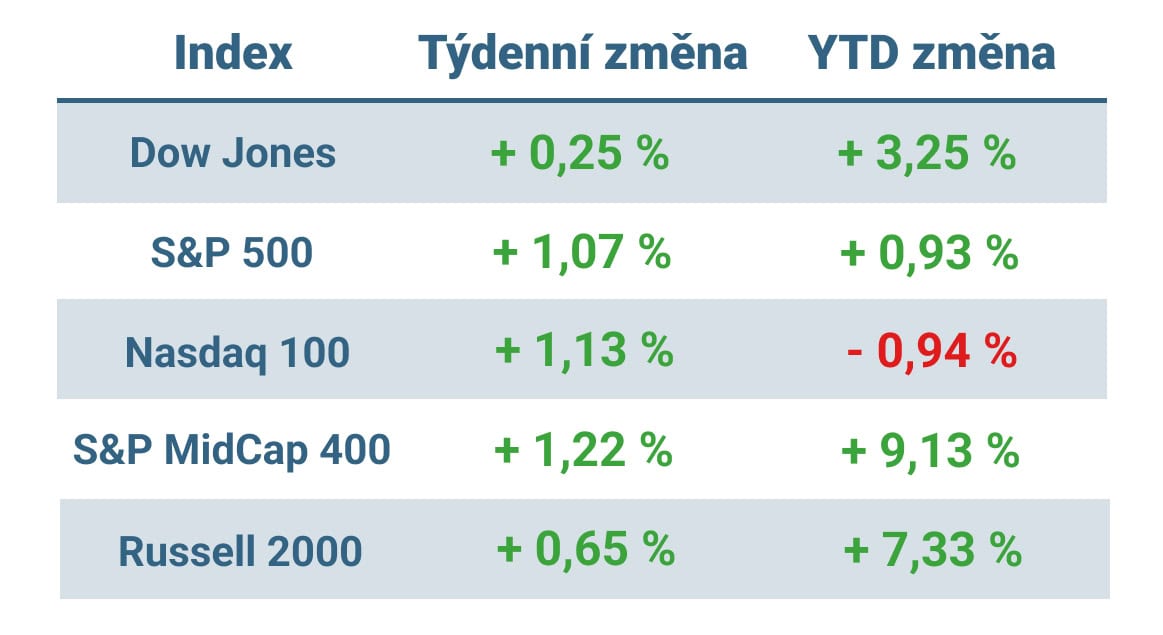 V uplynulém týdnu americké akcie rostly napříč celým trhem. Dow Jones přidal 0,25 %, zatímco širší S&P 500 posílil o 1,07 % a technologický Nasdaq 100 o 1,13 %.