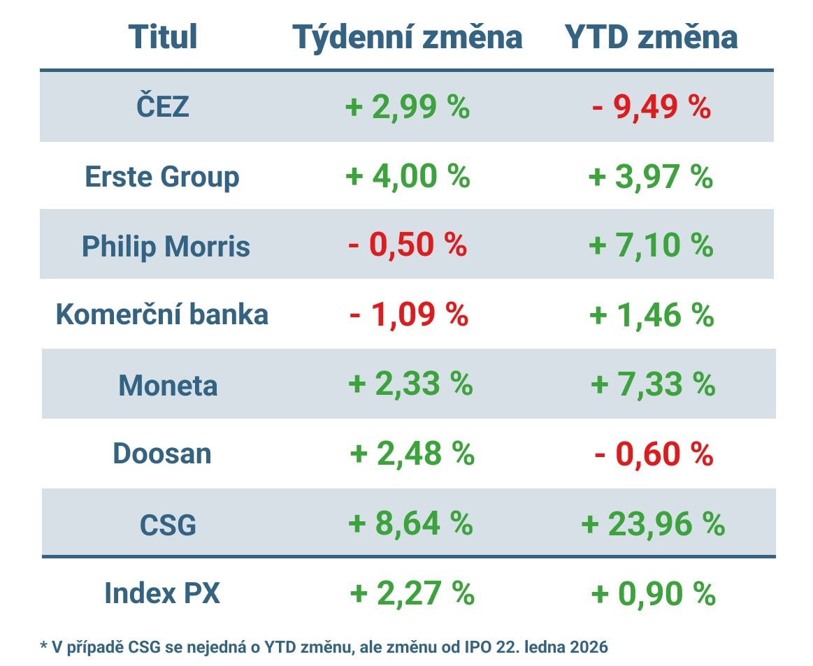 Největší show ovšem předvedla CSG. Její akcie ukázaly týdenní skok o 8,6 % a od vstupu na burzu (institucionálním) investorům vydělaly už 24 %.