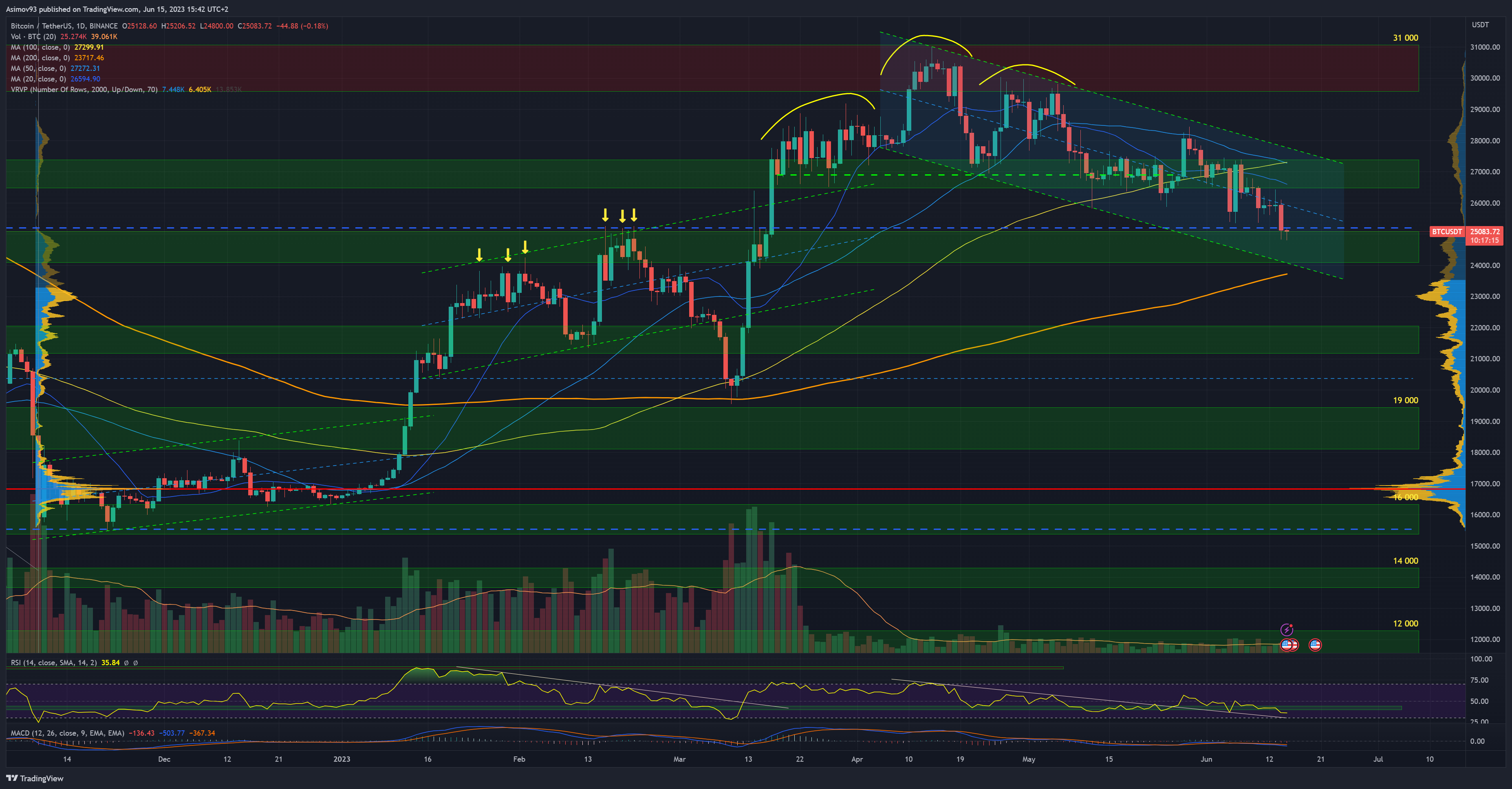 Bitcoin podle mně ovšem mnohem lépe reflektuje nové informace, protože zde ještě týž večer došlo k nemalému poklesu pod klíčový support kolem 25 000 USD. Dlouho jsme na to otestování čekali.