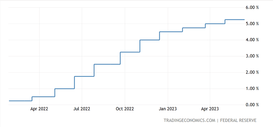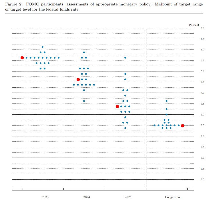 Po zasedání byla zveřejněná ekonomická projekce, ze které automaticky vyplynula jedna klíčová informace. Členové FOMC počítají s tím, že do konce roku dojde ještě dvakrát v růstu úrokové sazby o 0,25 procentního bodu. Jelikož terminal rate pro letošní rok (mediánová úroveň) je 5,6 %. A současná horní hranice target rate je 5,25 %.
