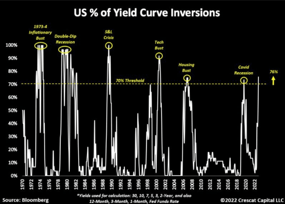 To se změnilo, protože nyní je výnosová křivka převrácená ze 76 %. A to je problém, protože jde o další jednoznačný signál pro recesi.