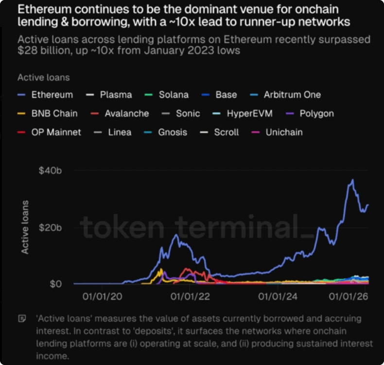 Pro srovnání, objem půjček na Ethereu je nyní zhruba desetkrát vyšší než na konkurenčních sítích jako Solana nebo Base.