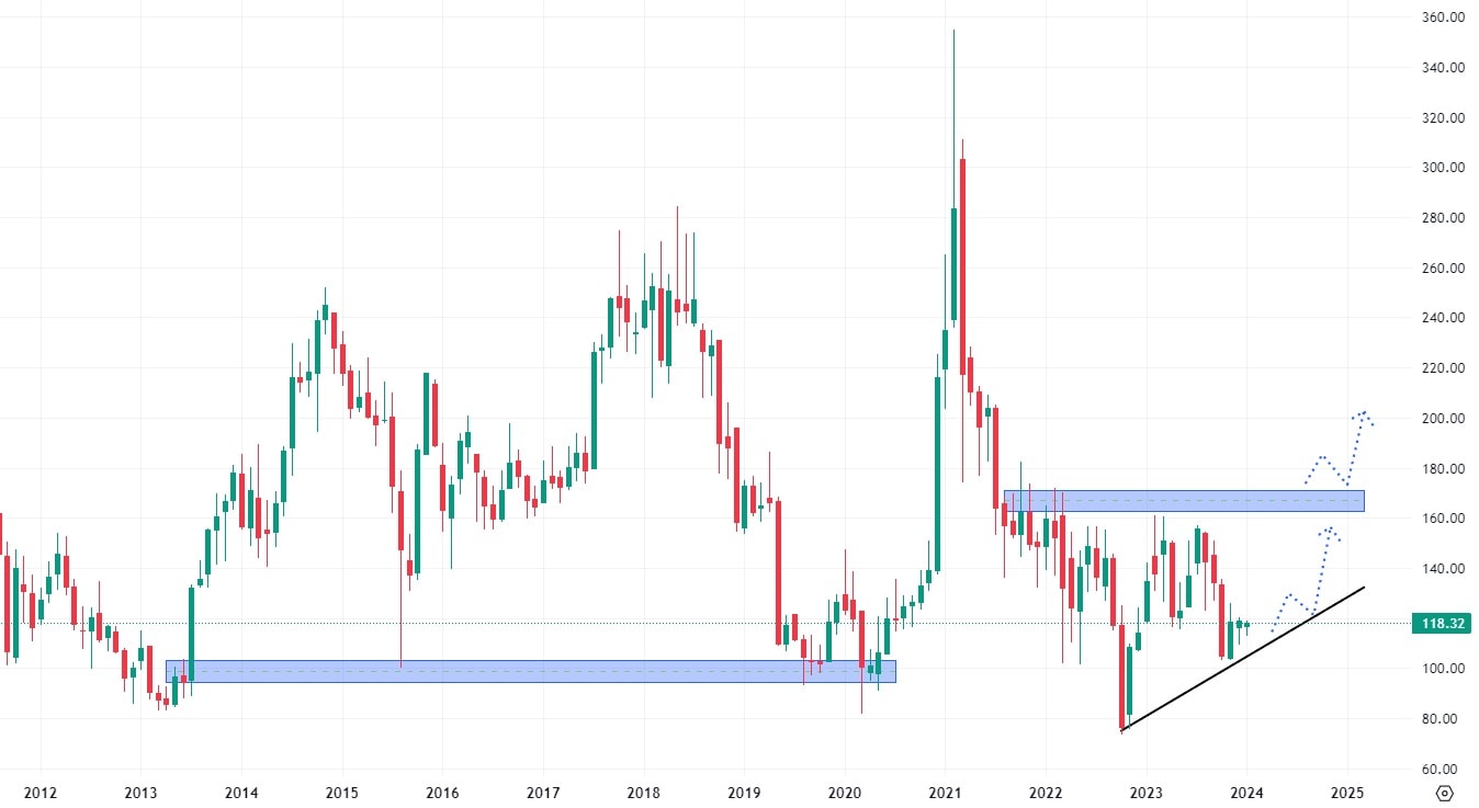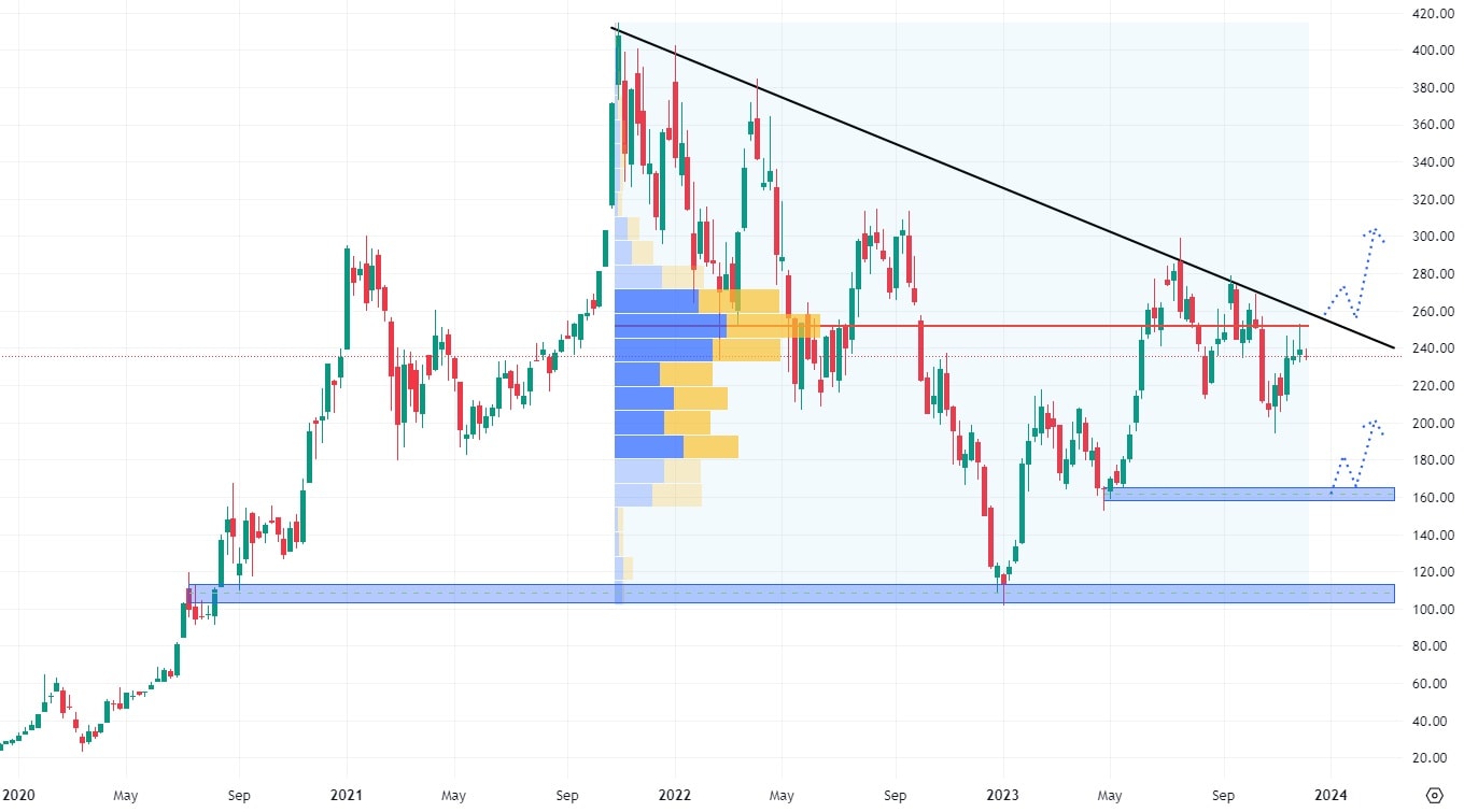 Akcie Tesla se stále obchodují pod hodnotou klesající trendové čáry, ovšem testů této dynamické rezistence bylo již mnoho, takže se zvyšuje pravděpodobnost jejího proražení. Pokud by akcie pokořily hodnotu 260 USD, budou podporovány v růstu nejsilnějším volume supportem od roku 2022.