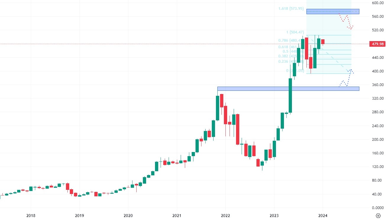 Hlavním rizikem růstu jsou množící se omezení vývozu čipů do Číny, která zaujímá největší podíl v exportu společnosti. Aby se tyto velmi pozitivní výhledy mohly naplnit, musí akcie Nvidia prorazit svá dosavadní cenový maxima. Podle Fibonacciho projekcí by následně měla být rezistence na ceně 580 USD. Nejbližší netestovaný support se následně nachází na hodnotě 350 USD.