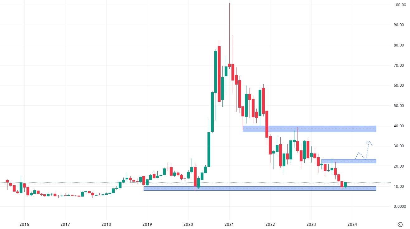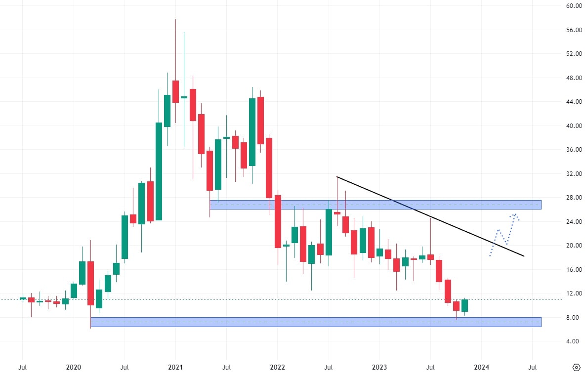 Akcie Sunnova Energy se obchodují pod hodnotou klesající trendové čáry poté, co se v minulém měsíci odrazily od svého dlouhodobého cenového minima. Nejbližší rezistence je ještě poměrně daleko a nachází se na ceně 27 USD za akcii, což je také hodnota cenových výběžků. Dokud trh neprorazí trendovou čáru, stále se budou akcie obchodovat v klesajícím trendu.