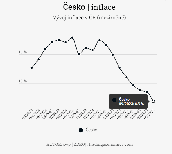 Inflace v České republice pomalu klesá již osmým měsícem. Pokles v září byl ale o něco výraznější než v předchozích měsících. V srpnu inflace činila 8,5 %, a podle Českého statistického úřadu se v září snížila až na hodnotu 6,9 %. Jedná se tak o nejnižší inflaci od prosince 2021!