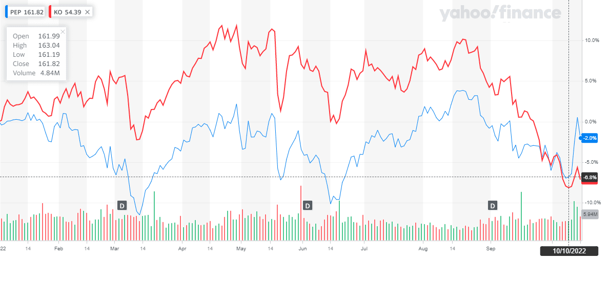 Srovnání ceny akcie s Coca-Colou ukazuje, že osudy akcií mají společný průběh. Od začátku roku se pohybují v kladných číslech. Což je nadprůměrný výkon amerických akcií. Index S&P 500 dosahuje v tomto roce záporné výkonnosti 20 %. Investice do nápojářských firem byla dobrá investiční strategie, jak ochránit peníze před inflací. Akcie těchto dvou firem mají obrovskou odolnosti vůči volatilitě.