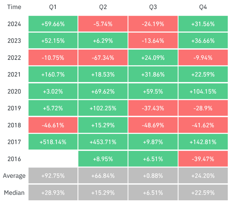 V 1. čtvrtletí roku 2017 a 2021 vzrostlo Ethereum o 518 % a 161 %, čímž překonalo zisky Bitcoinu o 11,9 % a 103,2 %.