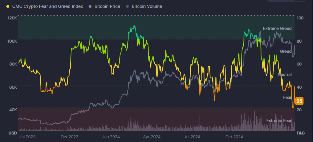 Kryptoměnový index strachu a chamtivosti zůstává v oblasti strachu na 25 bodech. To odráží přetrvávající obavy investorů a podtrhuje očekávanou volatilitu.