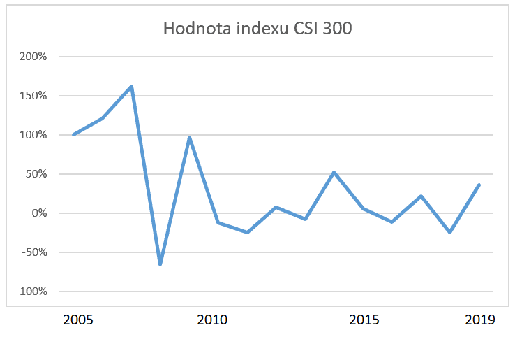 Tento index reprezentuje 300 největších akciových titulů obchodovaných na Šanghajské a Šenčenské burze. Je zjevné, že index dokáže meziročně vyskočit i spadnou klidně o 50 %.