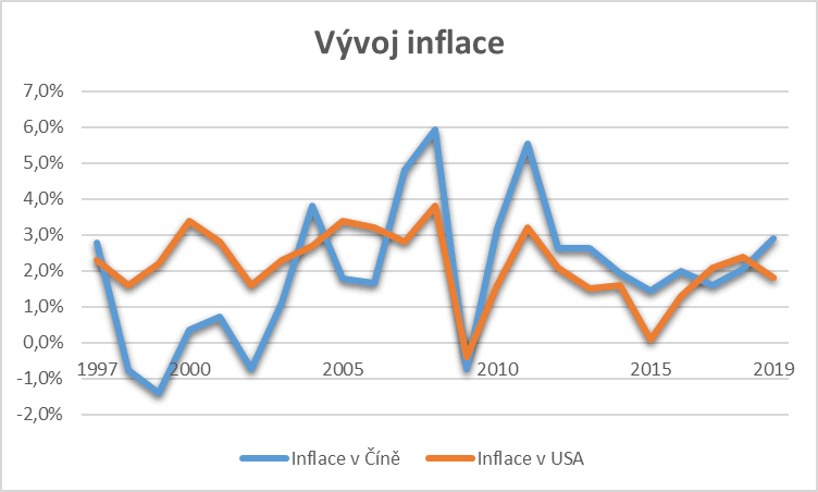 Další aspekt, na který se podíváme je inflace. Na grafu níže si lze snadno všimnou, že inflace v USA je mnohem stabilnější a trochu vyšší než v Číně. Obě země se potýkaly s deflací v roce 2008 při období krize a kromě tohoto roku inflace v USA nepřesáhla 4 % (ve sledovaném období).