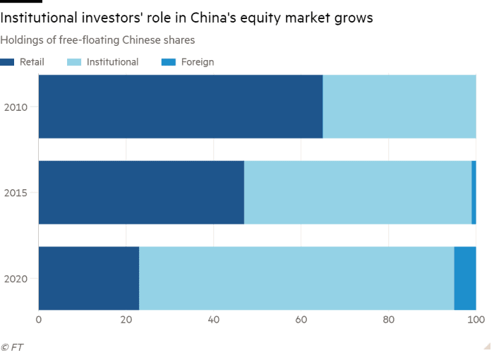 Na čínském trhu také přibývá institucionálních investorů, což by mohlo podpořit stabilitu a umírnit volatilitu. Před deseti lety se zde nacházelo stěží 40 % velkých investorů, ale dnes je to přes 70 %. Zároveň se objevují i zahraniční investoři.