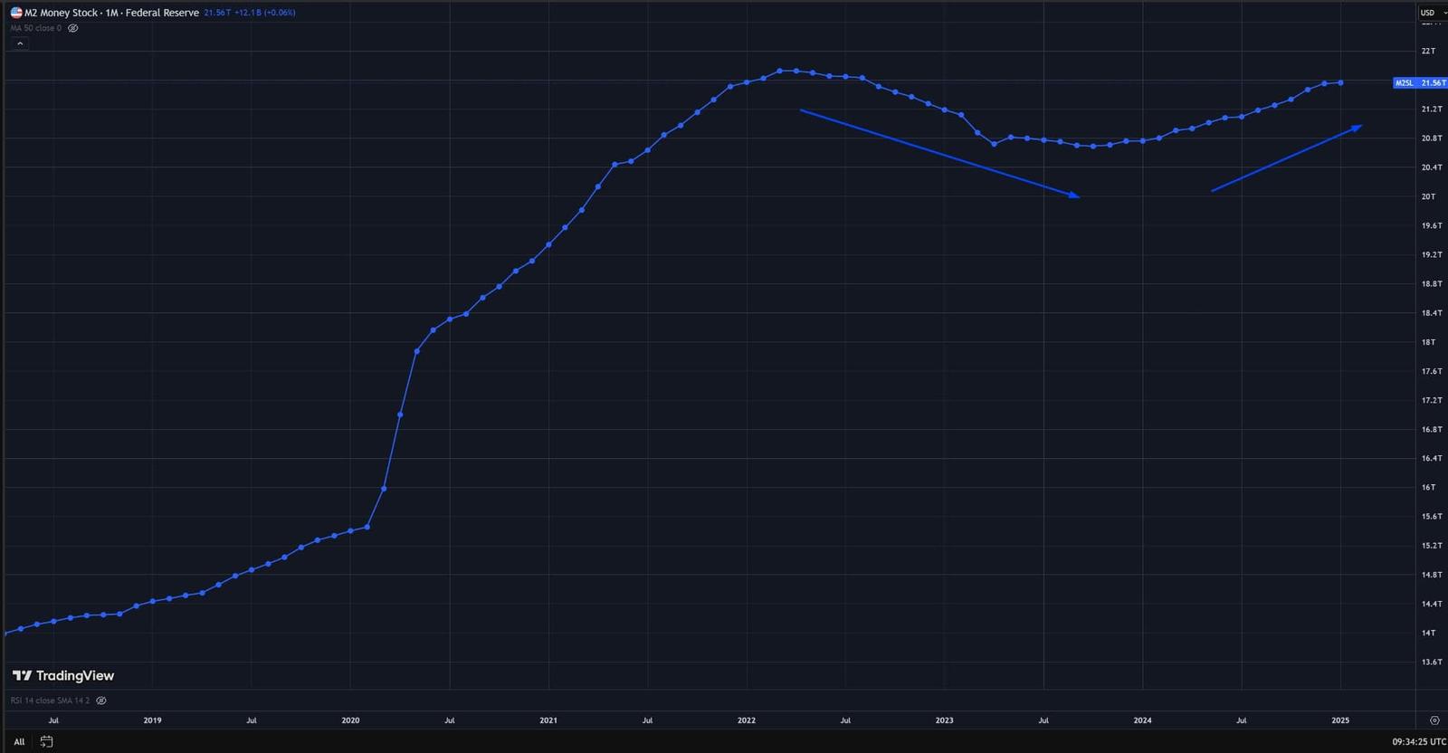 Momentálně jsme svědky třech zásadních trendů. Obrat vývoje M2 směrem k růstu. Snižování úrokových sazeb a snižování tempa kvantitativního utahování. To jsou všechno plusové body pro kryptoměny.