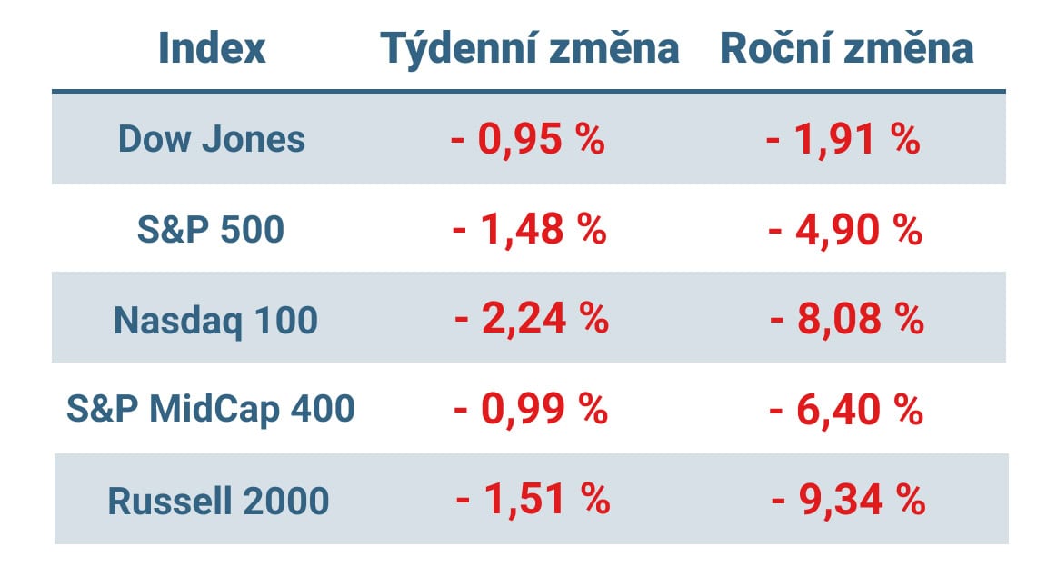 Americké akciové indexy v průběhu týdne klesaly, a to zejména v důsledku oslabení v sektorech informačních technologií a komunikačních služeb. Hodnotové akcie pak již šestý týden po sobě překonaly růstové akcie.