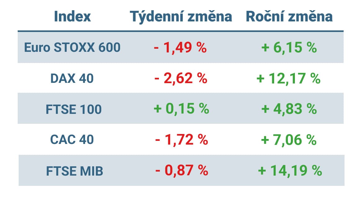 Německý index DAX odevzdal přes 2,5 % hodnoty, francouzský CAC 40 klesl o 1,72 % a italský index FTSE MIB oslabil o necelé 1 %. Pouze britský index FTSE 100 zakončil týden mírným růstem.