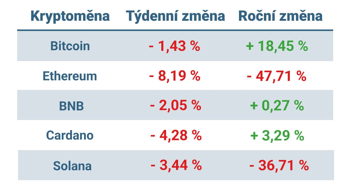 Týdenní ztráty mezi 2 a 4 % si připsaly také BNB, Solana a Cardano, přičemž Solana v ročním srovnání rovněž výrazně zaostává, když ztrácí přes 36 % hodnoty.