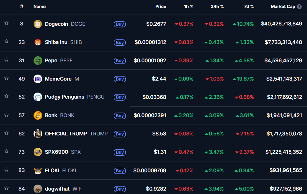Top 10 meme coinů dle tržní kapitalizace