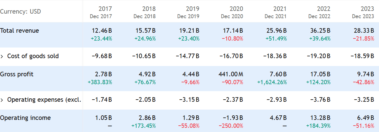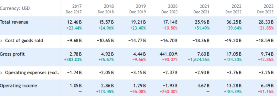 Pokud jde o aktuální rok 2024, odhad tržeb je 27,1 miliardy dolarů, což je mírný pokles oproti předchozímu roku. Definitivní čísla se dozvíme 18. 2. 2025, kdy budou reportovány finanční výsledky.