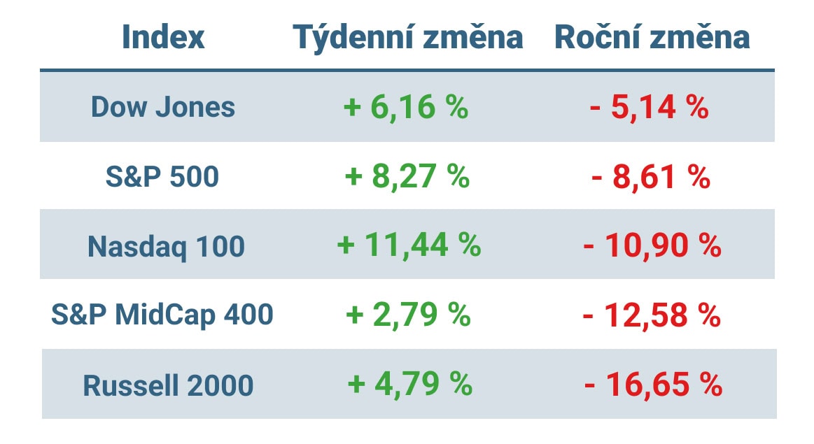 Indexy tak ve čtvrtek část zisků odevzdaly. Za celý týden však index S&P 500 vzrostl o více než 6 %, zatímco Nasdaq 100 uzavřel o 11 % výše. Index Russell 2000 zaostal, ale přesto si připsal téměř 5% zisk.