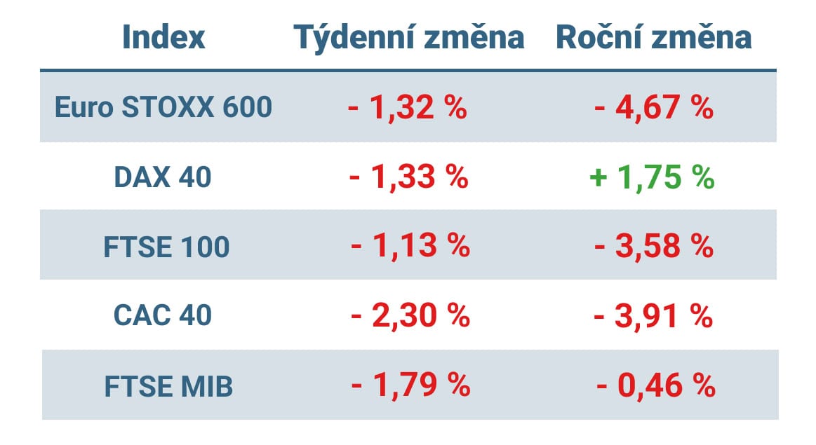 Největší evropské indexy, podobně jako ten celoevropský, v týdenní srovnání přesto klesly. Německý DAX o 1,33 %, italský FTSE MIB se snížil o 1,79 % a francouzský index CAC 40 ztratil 2,30 %. Britský index FTSE 100 pak klesl o 1,13 %.