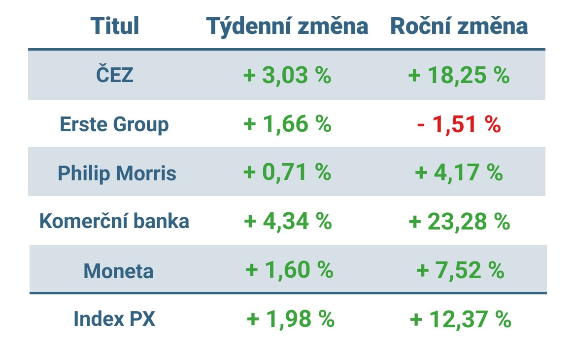 Ke konci týdne se index PX usadil na hodnotě 1 987 bodů, což znamená týdenní zisk téměř 2 %.