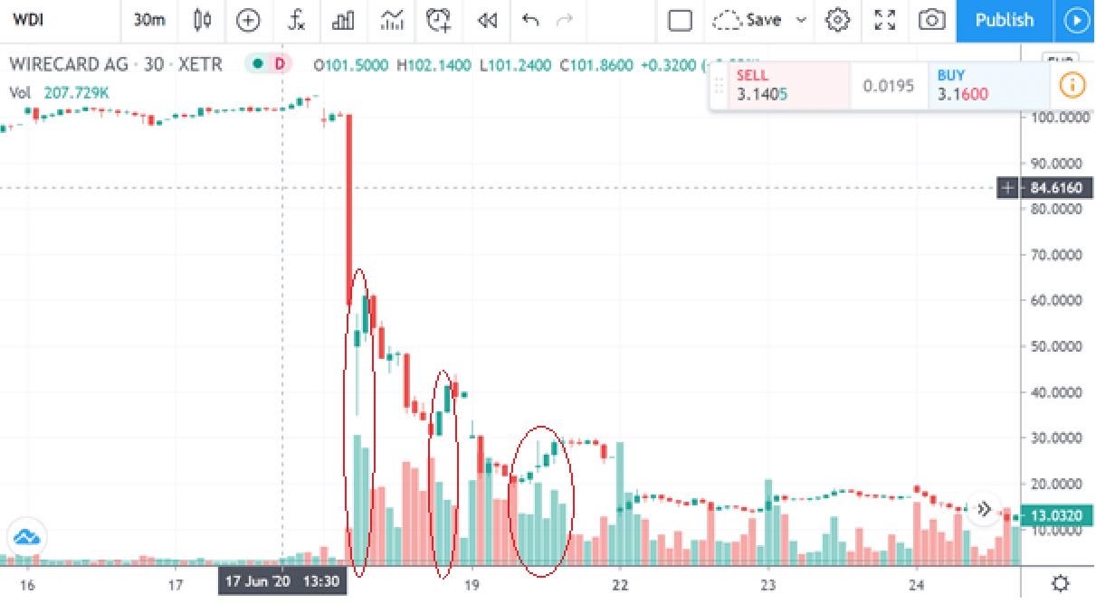 Detail propadu ceny akcií Wirecard na 30 minutovém svíčkovém grafu – nebyl zcela přímočarý (zdroj: tradingview.com)