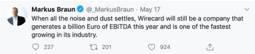 21. 9. 2019 – Markus Braun (CEO a spoluzakladatel) najmul KPMG (auditora velké čtyřky) na prověření firemního účetnictví po tom, co EY nechtěli audit dokončit. Zcela věří v dobrý výsledek, který má očistit pošramocenou pověst jeho firmy.
