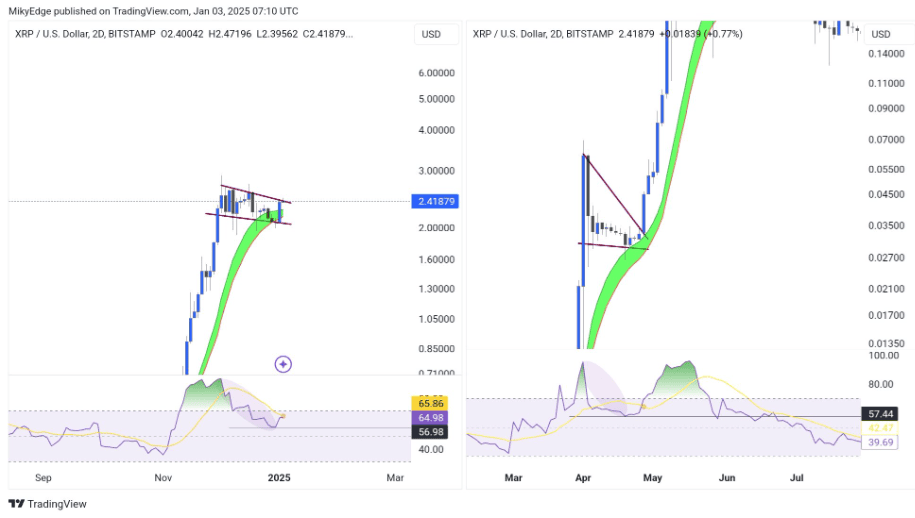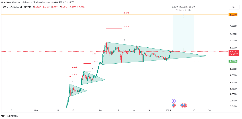 Současný cenový vzorec nastiňuje podobný vývoj, který by mohl XRP potenciálně katapultovat až na 5 dolarů, což je 110% nárůst oproti současné ceně.