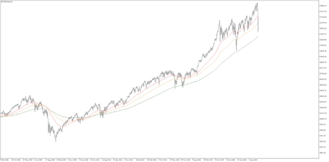 Na DJI30 je možné vidět nedávný prudký pokles, který byl způsoben především dopadem koronaviru na ekonomiku. Z dlouhodobého hlediska je však patrně vidět historie nákupu, kterou znázorňuje zelená vlnovka, která představuje 200denní exponenciální klouzavý průměr.